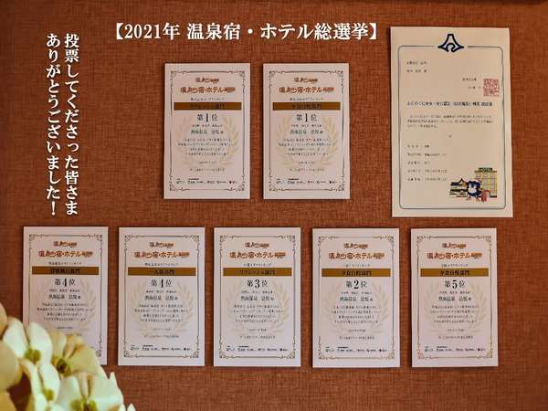 温泉宿・ホテル総選挙で獲得した賞状の数...