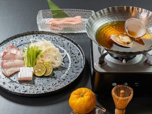 ご夕食:四季折々の地元の食材を使用した和洋折衷創作料理『ISHINOYA会席』