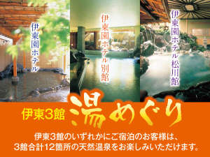 伊東温泉3館湯めぐり(本館・松川館・別館)3つのホテルの温泉を満喫1泊2食付きバイキングプラン