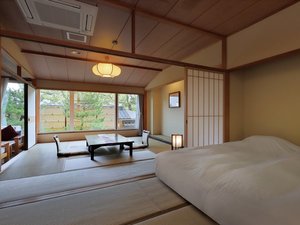 10畳和室でわいわいと楽しいひとときを過ごし、ハリウッドツインローベッドでお休み。当館では最低層階客室ですので、リーズナブルにお泊りいただけます。(お部屋からの景色は庭園・松林となり、海景のご覧いただけないお部屋です)