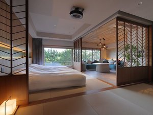 2024年6月リニューアル!松の緑をたっぷり感じるインドアテラスでリラックス・肩口からの湯で湯ったり温まり・シモンズ製ハリウッドツインローベッドでお休みください。(お部屋からの景色は松林となり、海景のご覧いただけないお部屋です)