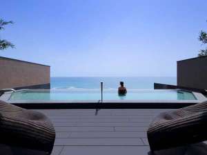 2024年6月リニューアル!松の緑をたっぷり感じるインドアテラスでリラックス・肩口からの湯で湯ったり温まり・シモンズ製ハリウッドツインローベッドでお休みください。(お部屋からの景色は松林となり、海景のご覧いただけないお部屋です)