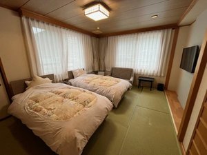 シングルベッドとセミダブルベッドをご利用いただける和室です。新たにスマートテレビを設置いたしました☆