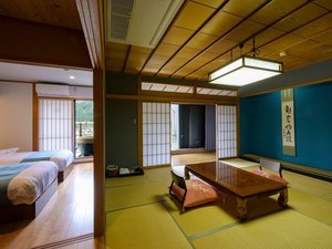【最上階露天風呂・サウナ付和洋室】和室のお部屋とベッドルームを備えた客室。