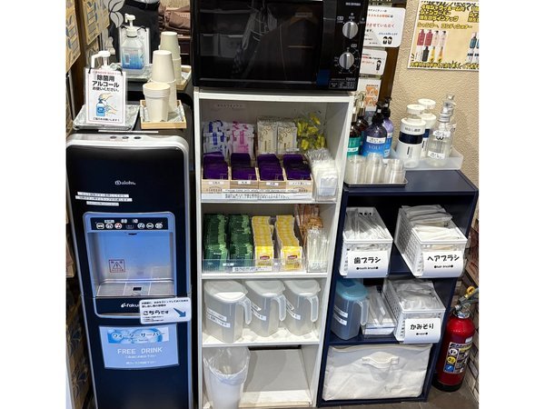 ロビーのアメニティバーに化粧水、乳液、...