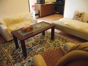 Dツインベットの部屋のソファ、テーブルコーナー。