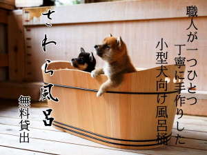 人が手作りした「さわら風呂桶」は無料貸出。ワンちゃんも温泉浴。