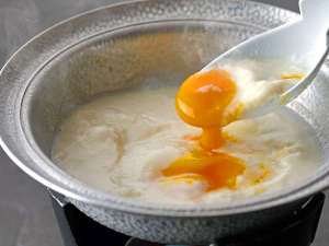 【ご朝食】最高級の豆乳と天然にがりで作る手作り豆腐。温玉をからめてどうぞ。