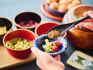 また、豆皿に少しずつ彩り豊かに盛り付けた「おばんざい」は、季節の野菜や地元の食材を生かした手づくりの味わい。少しずつ様々な味を楽しめる、旅の朝にぴったりの献立です。
