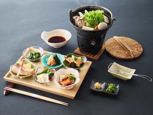 当館自慢の「湯豆腐」は、地元の名水と厳選した大豆から仕立てた、なめらかで旨み豊かなソフト豆腐(香川名物)を使用。熱々をそのままお召し上がりいただけます。