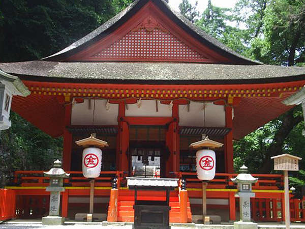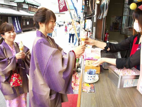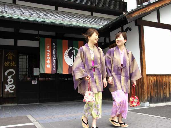情緒あふれる宿入口。色浴衣で記念写真を...