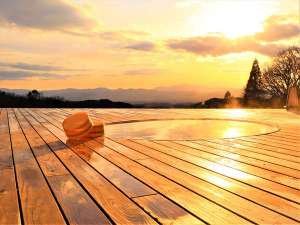 貸切露天風呂「天空の湯」。赤く染まる夕暮れ時の天空の湯は心に残る絶景です。