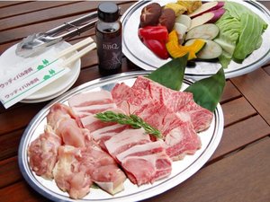 食材(お一人あたり):国産牛120g、豚肉80g、若鶏100g、カット野菜、BBQたれ
