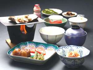 朝食は飛騨名物の朴葉みそや、飛騨産コシヒカリのご飯を中心とした和朝食、