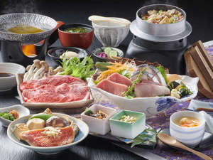 炊きたてを味わう釜飯、お刺身盛り合わせ、牛肉のしゃぶしゃぶ、金目鯛の煮付け、デザートなど。