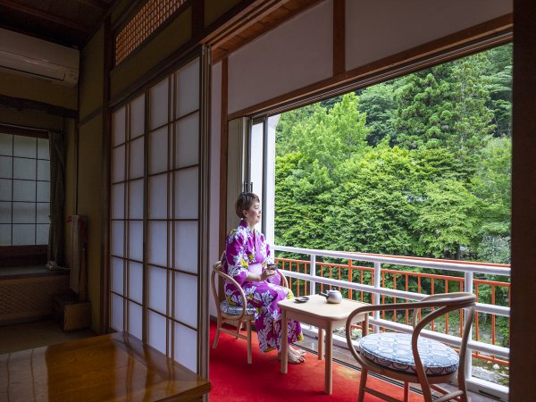 2階の川側客室。広々設計。向いに龍泉寺...